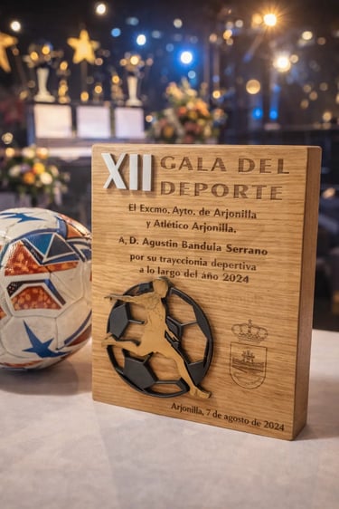 En PREMIOS RAÍZ somos especialistas en la fabricación de trofeos madera y reconocimientos personalizados para ayuntamientos, entidades públicas y eventos deportivos. Nuestra producción combina madera sostenible con tecnología láser de alta precisión, sublimación e impresión DTF a todo color, lo que nos permite ofrecer soluciones completas adaptadas a cada institución.