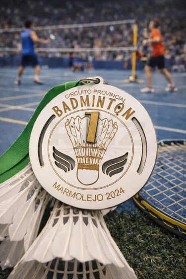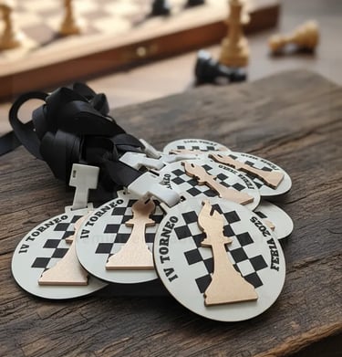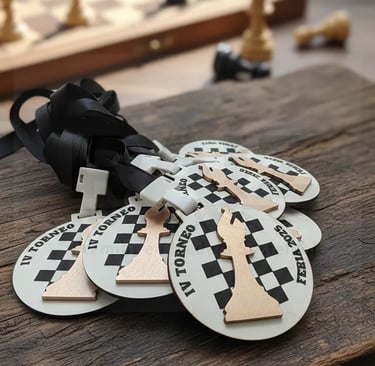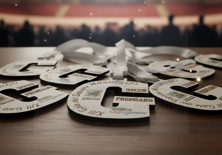 Medallas personalizadas en madera sostenible, con grabado láser e impresión a color para eventos municipales y deportivos.