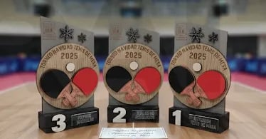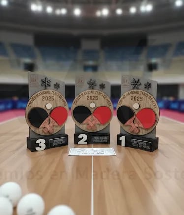 Trofeos personalizados en madera sostenible para eventos deportivos y actos institucionales.